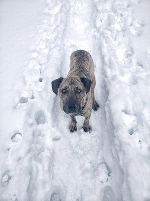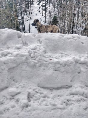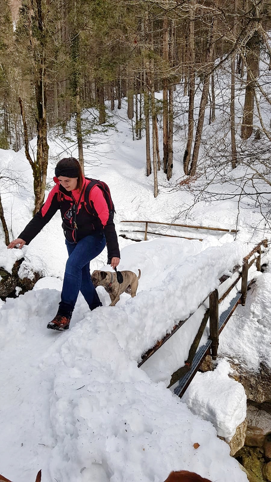 Direkt ab dem Parkplatz geht ein tollen Pfad am Bach „Große Laine“ entlang. Durch den vielen Schnee ist es gut zu schauen wo genau ihr lauft, den teilweise geht es ein gutes Stück abwärts zum Bach. Wie der Weg im Sommer ist, kann ich nicht sagen, das werde ich aber sicher auch noch ausprobieren. Der Großteil des Weges waren Pfade an besagtem Bach entlang, oft mussten wir Brücken überqueren, welche durch den Schnee quasi ohne Geländer genutzt wurden, mit Höhenangst sicher eine Herausforderung. Ich hatte auch teils etwas Angst und fand es sehr aufregend, es hat mega viel Spaß gemacht. Bitte passt auf eure Hunde und euch bei sowas auf. Wir haben unsere Hunde meist direkt hinter uns laufen lassen, damit sie nicht toben oder Blödsinn machen.