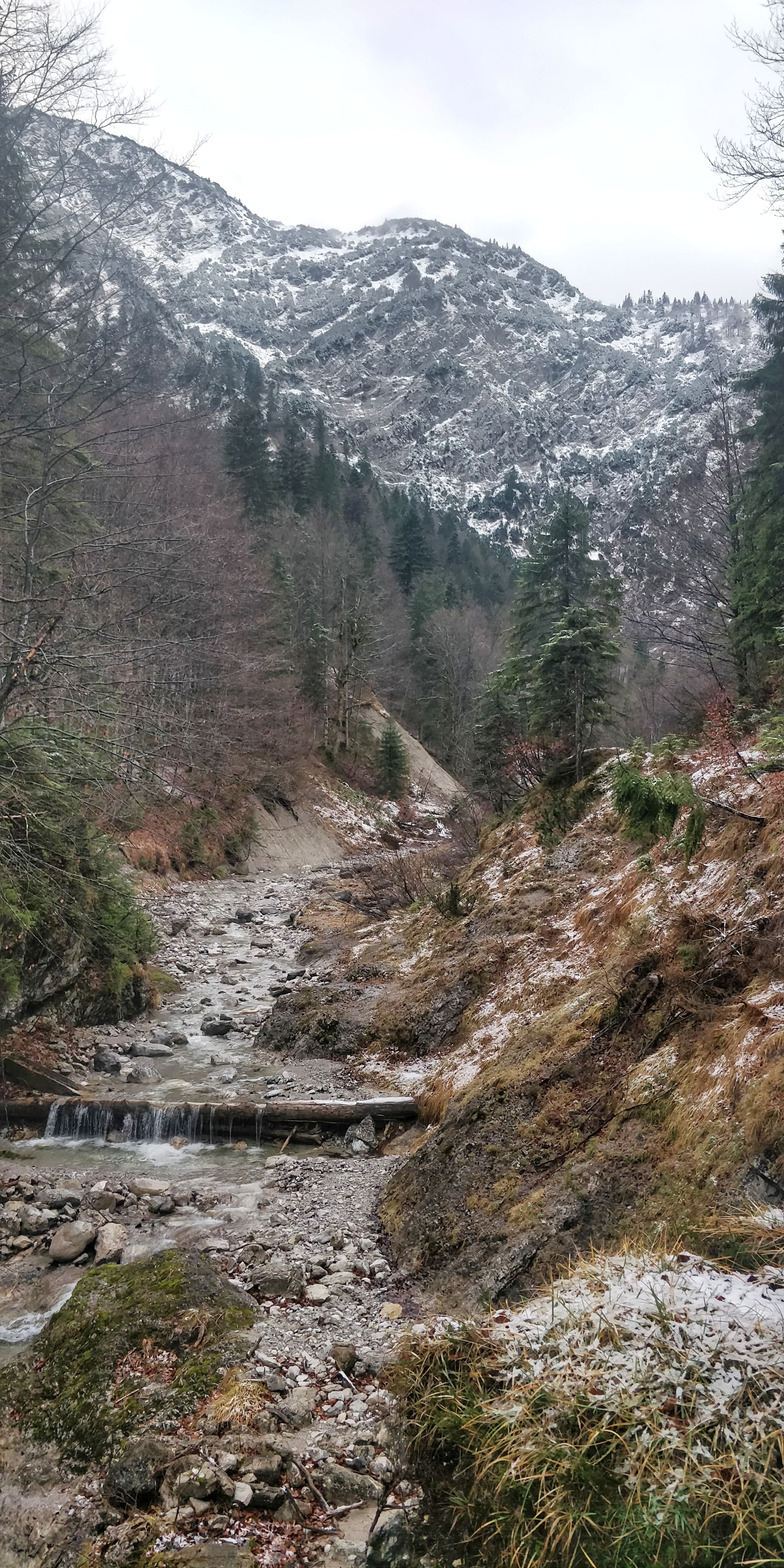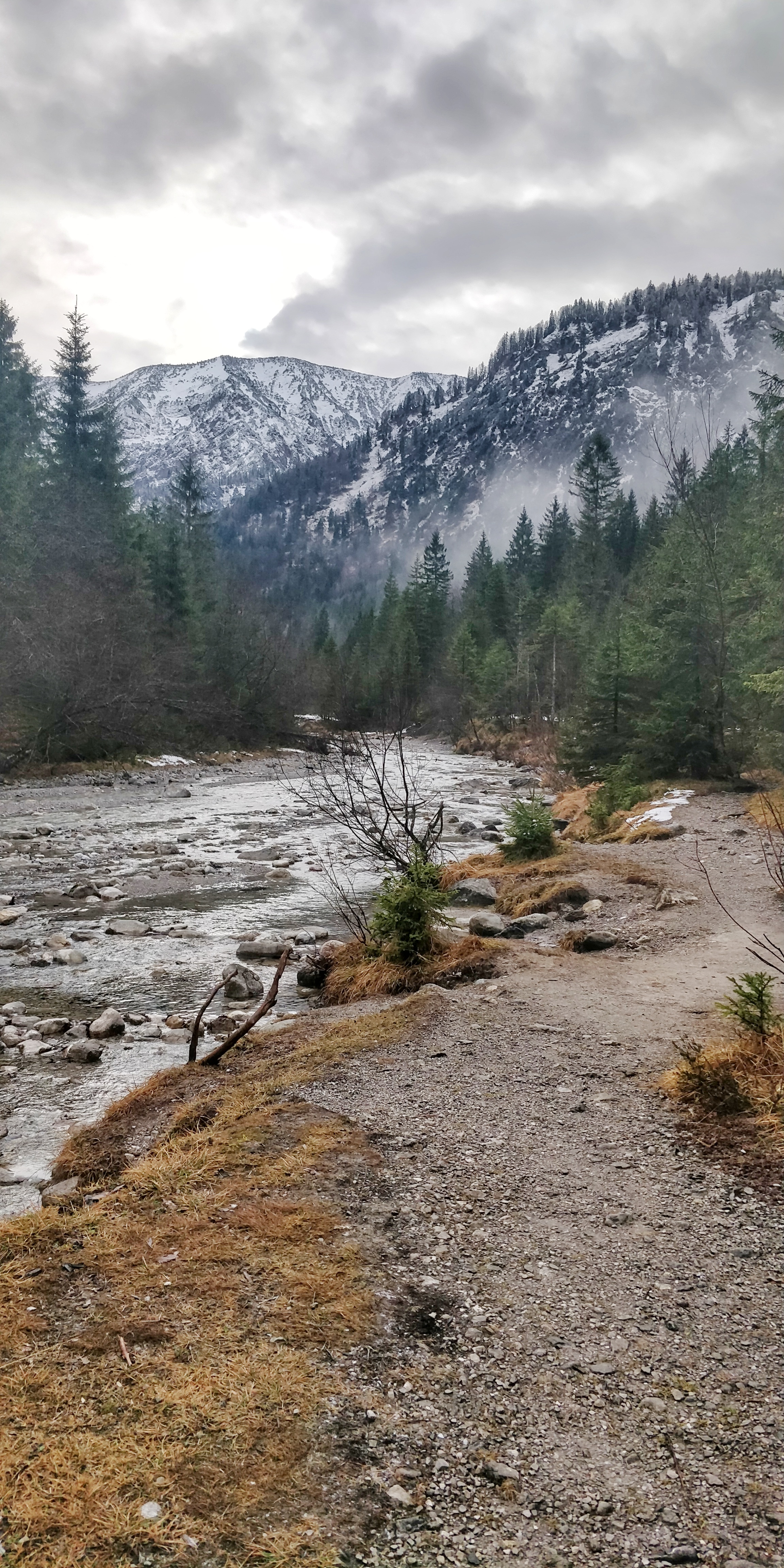Geparkt haben wir auf dem Wanderparkplatz Wildbad Kreuth und sind dann am Wildbad Kreuth und der herzoglichen Fischzucht vorbei um westlich am Bach „Hofbauernweißach“ Richtung Almwirtschaft Siebenhütten (Info der Seite: Im Winter ist Siebenhütten geschlossen! Auf der Talseite ziehen sich zwei gefährliche Lawinenkegel über den Spazierweg und über das alte Bad ist wegen der Wildruhe der Weg gesperrt!) zu laufen. Ihr könnt im Winter auch nur diesen Weg gehen, denn der auf der Ostseite des Baches ist gesperrt. In diesem Bereich war noch recht viel los für das schlechte Wetter, bei gutem Wetter würde ich diese Route definitiv nicht gehen!